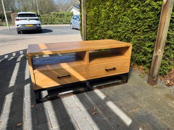 Mooi industrieel tv-meubel met een robuuste uitstraling. Het meubel is voorzien van twee handige lades en twee open vakken, ideaal voor het opbergen van media-apparatuur en accessoires. Het meubel is