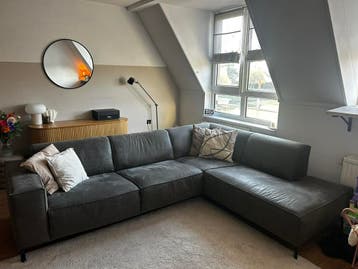 Moet weg wegens verhuizing: onze hoekbank in antraciet met zwarte ijzeren pootjes, gemaakt van polyester stof met een strakke, lederlook-achtige uitstraling. Eén rugleuning is iets doorgezakt, verder