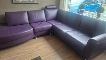 Deze ruime paarse hoekbank is gemaakt van stevig leer. De bank is nergens doorgezakt en verkeerd in goede staat. Een fijne bank om lekker op te zitten de lange muurzijde is 270 cm en de raamzijde is 2