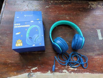 Doqaus kinder koptelefoon, met doosje en draad met dubbelfunctie. Er kan een tweede koptelefoon worden ingeplugd. De kabel moet af en toe goed aangeduwd of gedraaid worden. Gratis af te halen.