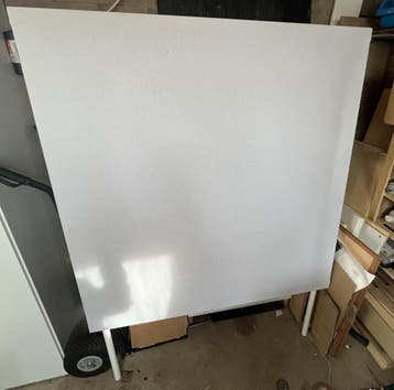 Groot akoestisch paneel op poten. Ideaal tegen galm in opnamestudio's. Twee lagen steenwol in een raam van aluminium studs, bekleed met wit canvas. Aan de onderkant zijn twee tafelpoten gemaakt, z