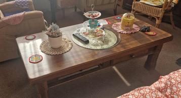 Gratis! Zware eiken salontafel, 72 breed, 45 hoog en 147 lang. Bankstel 170 breed, 92 hoog, en 82 diep. Beiden in prima staat! Er ligt op de foto een doek over de bank maar hieronder is de bank ook no