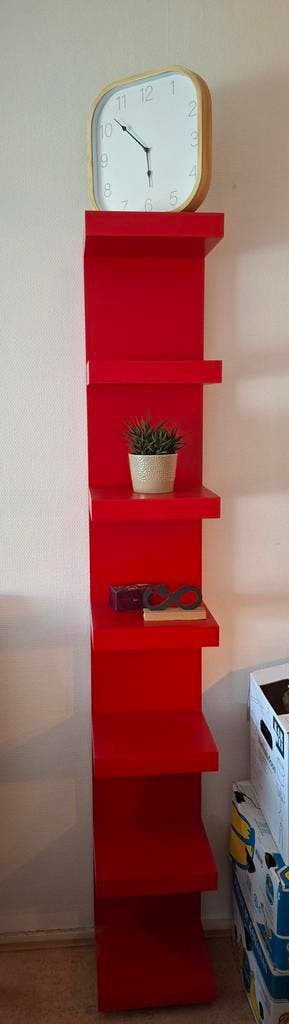 Deze rode wandkast heeft 6 vakken. Hij is aan de muur te bevestigen. Afmeting 30×180 bij afhalen zelf van de muur demonteren.