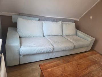 Deze bank heeft drie zitplaatsen en is bekleed met stof. Er zijn wat vlekken zichtbaar op de zittingen en armleuningen. De bank is lichtblauw van kleur.