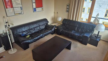 Zwart leren leolux bankstel met een 2-zits en een 3-zits bank. Zwarte salontafel. Er is in de woonkamer gerookt.