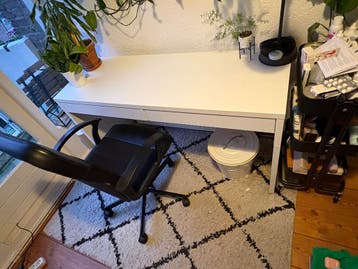 Wit bureau van ikea (micke) met twee handige lades voor opbergen. Onderaan het bureau is een houder bevestigd voor je verlengsnoer, zodat kabels netjes weggewerkt zijn. Het bureau heeft wat beschadigi