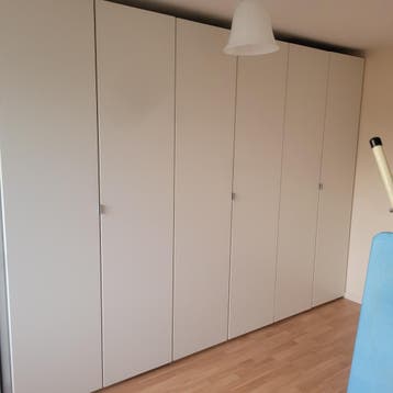 Deze kledingkast is zo goed als nieuw. Hij is 300 cm breed, 60 cm diep en 220 cm hoog. Er zit een boekje bij en ook nog reserve onderdelen. De kast moet zelf uit elkaar gehaald worden. De kast staat i