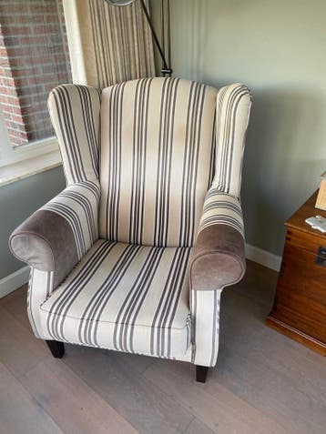 Wij hebben deze stoel over. Hij zit heel lekker maar de stof is verschoten. Hoog 110 diep 90 breed 90