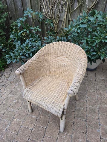Een rieten stoel met een lichte kleur. De stoel heeft een gevlochten patroon in de rugleuning. De poten en armleuningen zijn ook van riet.