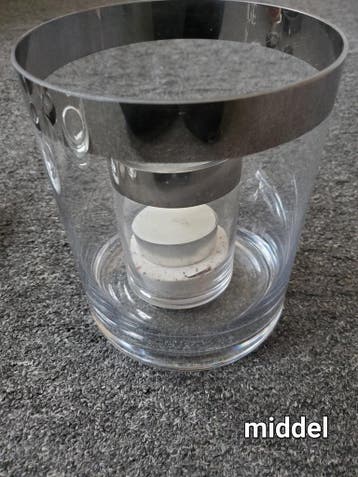 Mooie glazen hurricane middel van riviera maison. Geschikt voor een kaars of groot waxinelichtje. Geeft een sfeervolle verlichting. In goede staat. Gaat weg ivm veranderen van interieur. Kijk ook eens