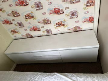 Deze brede witte tv kast is gratis af te halen. Hij staat op de verdieping, dus je moet hem zelf sjouwen.