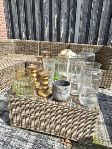 Een verzameling van diverse vazen en kandelaars. Er zijn glazen vazen in verschillende vormen en maten, waaronder een geribbelde groene vaas. Ook zijn er gouden kandelaars en een grijze pot. Wil je me