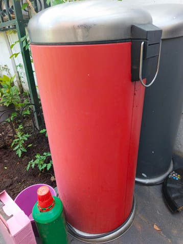 Een rode prullenbak met een metalen deksel. De prullenbak heeft een handvat aan de zijkant. De onderkant is ook van metaal.