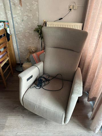 Prominent sta op stoel, defect. Kan wel als gewone stoel gebruikt worden, of misschien gerepareerd worden.