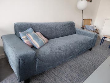 Bank is 2.10 Lang. Hij is opnieuw bekleed, aan de achterkant is de eerdere stof te zien, aan voor- en zijkanten niet. Kleur is iets donkerder dan op deze foto's.