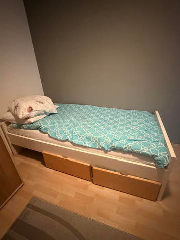 Eenpersoonsbed met handige opberglades onder het bed, ideaal voor extra ruimte. Het bed is gebruikt, maar in goede staat en kan nog prima een ronde mee. Perfect voor een kinderkamer of logeerkamer. Ma