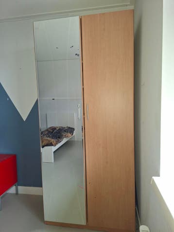 Kledingkast met spiegel ruime stevige kledingkast in goede staat. 1 Van de deuren is voorzien van spiegel. Zowel hang als leggedeelte. Zelf demonteren. Hoogte 224 breedte 100 diepte 58 gratis af te ha
