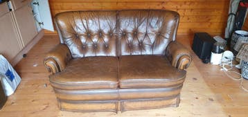 Een bruin leren bankje. Het bankje heeft een klassieke uitstraling met knopen in de rugleuning en armleuningen.