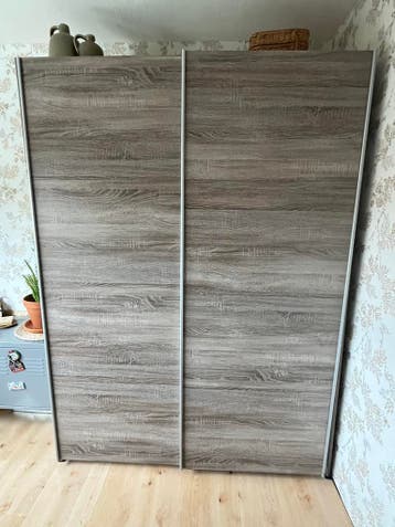 Nog in goede staat kledingkast 2 schuifdeuren aan de linkerzijde zit een verfvlek ( van het verven vd radiator) verder is de kast in grijze eiken fineer 150 breed 206 hoog kan vanaf zaterdag 18/4 word