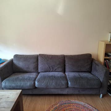 In goede staat, 1 klein gaatje. Niet doorgezakt. L x b xh : 219x 87x 66 cm graag zsm ophalen, anders gaat de bank naar de kringloop.