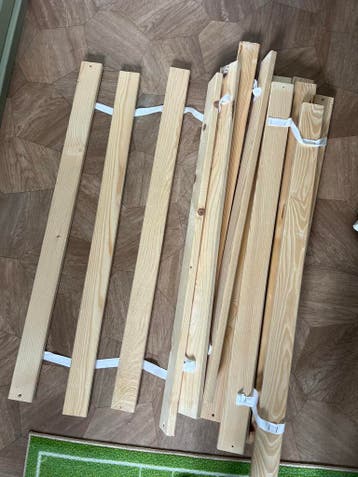 Oprolbare lattenbodem, ziet er nog goed uit. De latten zijn aan elkaar bevestigd met een wit lint. Klaar voor gebruik.