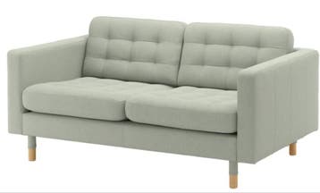 Een gebruikte landskrana tweepersoons bank met gebruikerssporen.de bank is lichtgroen van kleur en heeft houten poten. De kussens hebben een gestikt patroon.