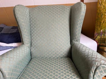 Deze comfortabele oorstoel in een lichte, mintgroene kleur is ideaal om heerlijk in te ontspannen. De stoel heeft een klassiek patroon en is bekleed met een zachte stof. Perfect voor in de woonkamer,