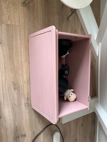 Leuke kist. Wel even scharnieren vastzetten met schroeven.