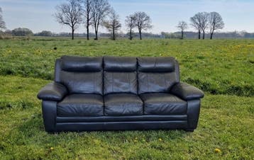 Deze zwarte leren banken zijn gebruikt en hebben gebruikssporen. Met wat leerpoets kunnen ze er weer mooi uitzien. Ze zijn perfect voor een studentenwoning of keet. Het zijn een 3-zits en een 2-zits b
