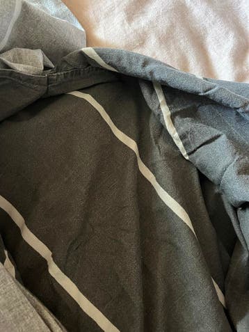 Dit is een lits jumeaux dekbedovertrek van katoen. Het is grijs met witte strepen. Het overtrek is op de 2e foto opgevouwen en binnenstebuiten te zien. Goede schone uitgewassen staat