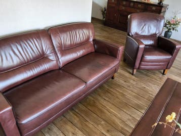 Ik verkoop dit omdat we gaan veranderen van meubels 1 x 2,5 zits leren bank + 2 fauteuils in bordeauxrood 1 x salontafel 1 x tv kast 1 x bijzettafel de conditie is gebruikt maar netjes zelf ophalen op