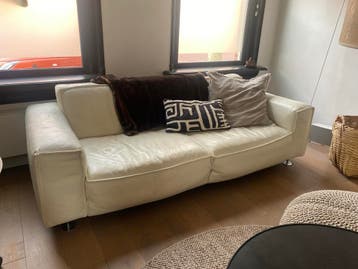 Twee leren banken van het merk montel. Gebroken wit. Ze zijn 230 x 94 cm groot. De banken zijn gebruikt maar zien er nog goed uit.
