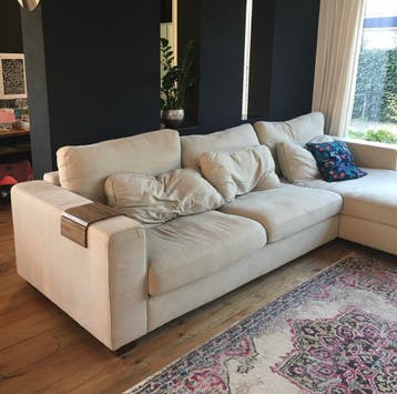 Hoekbank (zie eerste foto ). Het zijn 2 delen, hij staat nu in twee aparte stukken (zie laatste foto) maar dat kan je makkelijk in elkaar klikken. Zit heerlijk maar wel flink gebruikt. Nooit gerookt o