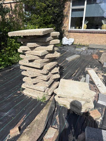 Een stapel tegels en wat losse stenen. Ze zijn gebruikt en liggen buiten. Mogen gratis meegenomen worden