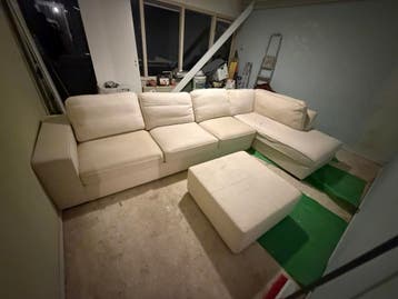 Bank is wel vies heeft een grondige schoonmaak nodig en de rist van de grote kussen is stuk maar kan vervangen worden (zie foto) zo snel mogelijk ophalen