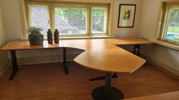 3 bureaus, gratis af te halen. Staan op de 1e verdieping. Moeten wel zelf gedemonteerd worden.