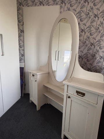 Deze mooie kaptafel zoekt een nieuwe eigenaar die er weer een prachtig meubelstuk van kan maken. De kaptafel heeft een likje verf nodig, maar de basis is goed. Wie maak ik hier blij mee?
