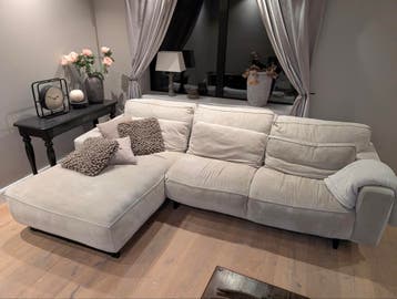 Gebruikte bank met een lichte kleur. De bank heeft een lounge gedeelte aan de linkerkant. De afmetingen zijn 284 cm breed en 188 cm diep.