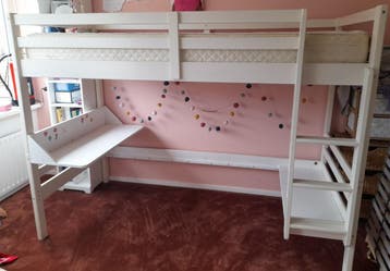 Verbouwd stapelbed. Met bankje rechts en bureautje links. Is gebruikt, maar kan nog prima een ronde mee. Hij is al uit elkaar gehaald. Zonder matras. Lang: 2.08M diep: 1.01M hoog: 1.55M