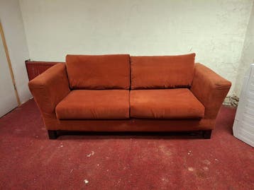 Gratis af te halen een leuke tweepersoonsbank in een rood/oranje kleur. De bank heeft twee zitkussens en twee rugkussens. De poten zijn donker van kleur. De stof is effen.de conditie is gebruikt maar