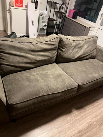 Een grote bank met twee zitkussens en twee rugkussens. De stof is groen van kleur en zit lekker. De bank is gratis af te halen.