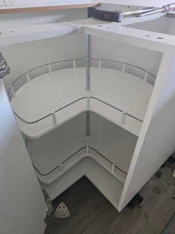 Carrousel / draaiplateau voor een hoekkast in de keuken. Komt uit een bestaande keuken en wordt aangeboden vanwege vervanging. 2 Draaiplateaus geschikt voor hoekkast met centrale as gebruikte staat, z