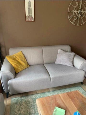 Een lichtgrijze tweezitsbank met stoffen bekleding. De bank heeft een strakke vormgeving en staat op donkere poten. Breed: 185 cm diep: 90 cm hoog: 83 cm gratis af te halen in hilversum!