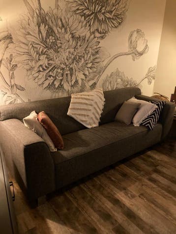 De bank is 230cm lang. Een grijze gemeleerde bank met stoffen bekleding. De bank heeft vierkante armleuningen en staat op kleine, zilverkleurige pootjes. In gebruikte staat!