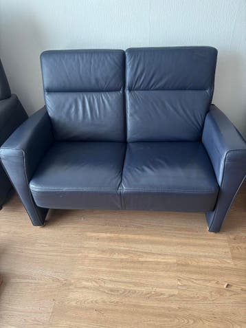 Comfortabele tweepersoonsbank met donkerblauw leer. De bank is in goede staat. Ideaal voor kleinere woonkamers of als extra zitplek.