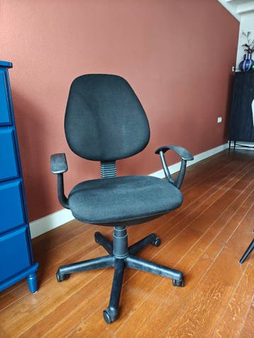 Gebruikte bureaustoel in erg nette staat > zwart, stof > in hoogte verstelbaar, werkt soepel > wielen in zeer goede staat
