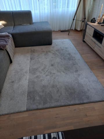 Een grijs vloerkleed met een rechthoekige vorm. Het kleed heeft een afmeting van 230 bij 170 centimeter. De kleur is grijs, met een lichter grijs vlak aan één zijde. Het kleed is te zien op een houten