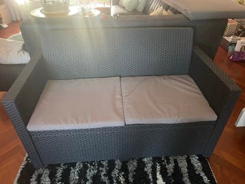 Donkergrijze tweepersoonsbank met een gevlochten patroon. De bank heeft twee lichtgrijze zitkussens. Er is een kleine beschadiging aan de rechterarmleuning. Bank 130 x 62x 80