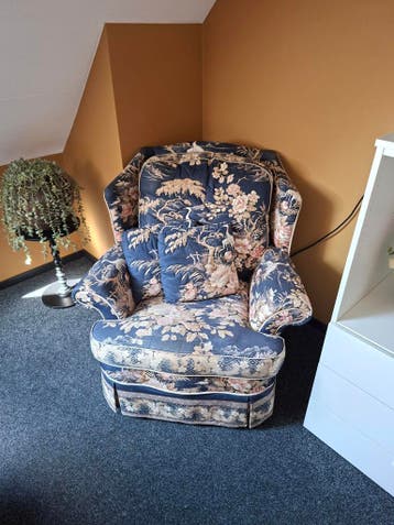 Deze fauteuil heeft een bloemenprint in blauw en roze tinten. Er zitten twee kussentjes bij in dezelfde stof. De stoel is bekleed met stof. In zeer nette staat. Mag spoedig opgehaald worden.