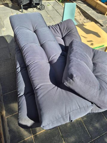 Kussens voor paletten. Het zijn 1 zitkussen, 1 rugkussen en 1 zijkussen. Het zitkussen heeft wat schimmelvlekken. Dit komt door een regenbui van 2 jaar geleden en het niet goed laten drogen daarna. De